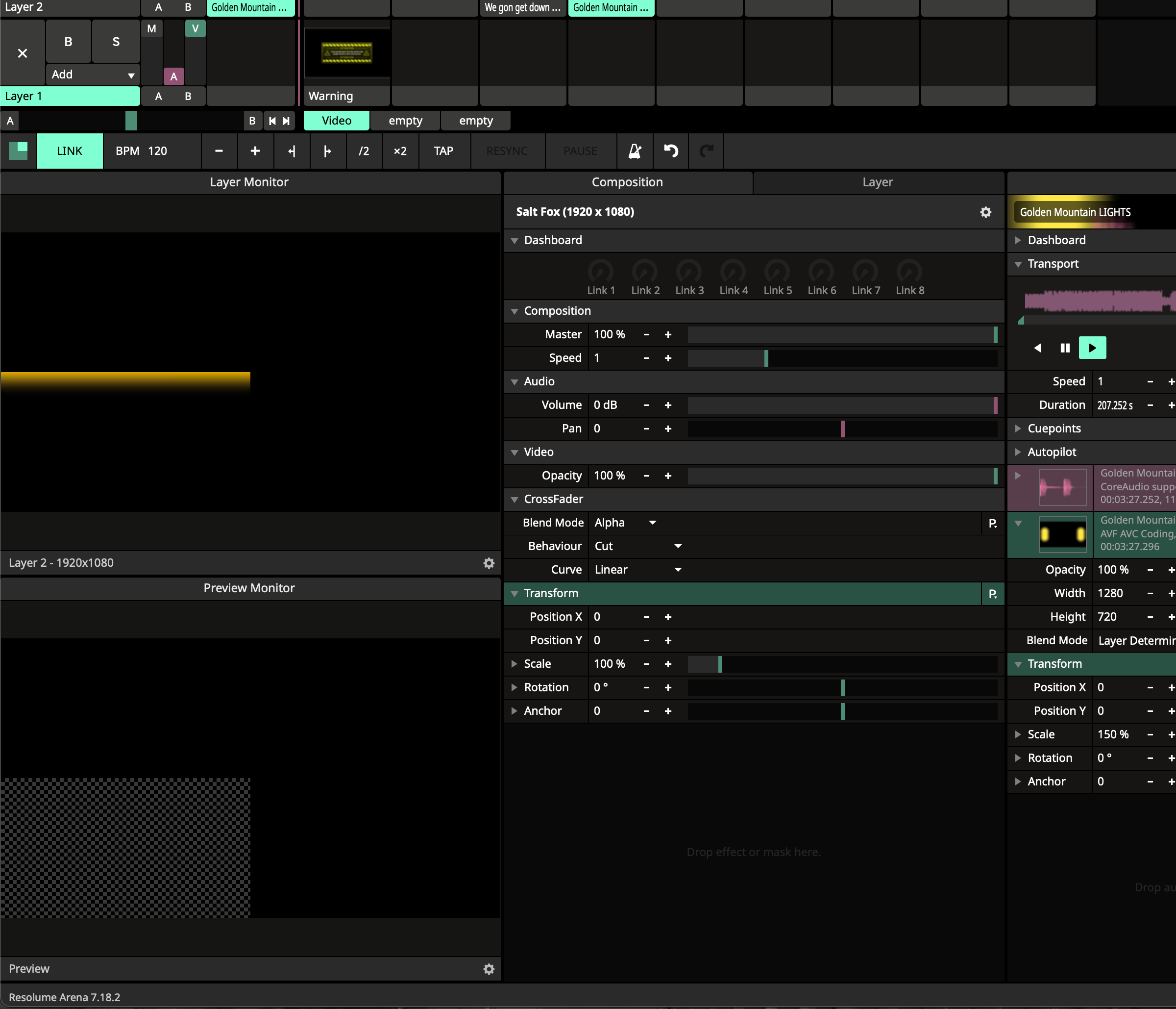 Hi all! I was playing a show the other night and opened my 4K project that has two pixel mapped wireless DMX lights and then HDMI output on my computer goes to a projector. The projector I plugged into was 1080P, so I in a rush I rescaled everything down but I also noticed at the same time the preview and layer monitors in the bottom left side of the program are strangely cropped now (See image).