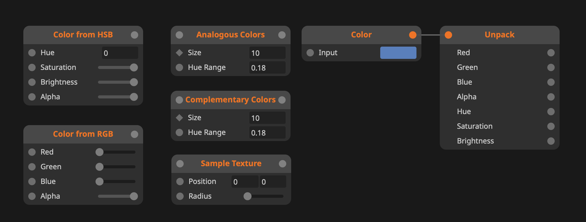Wire 7.20 introduces the Color Type. This new type allows you to be much more flexible with your color management in Wire. The Color In and Color nodes will now produce a color type. Additionally, we've added the Color from RGB and Color from HSB nodes that increase your color making capabilities. The Analogous Colors and Complementary Colors nodes will produce a color palette for you, based on the input color. The Color Type can be unpacked to get individual components of the color. The much-requested Sample Texture node has also arrived with this update, which allows you to sample colors from a texture. As cherry on the cake, we've updated effects like Hue Rotate, Greyscale, AddSubtract, and Bright.Contrast to accept the Color type, allowing you to apply these effects directly to colors. 🌈