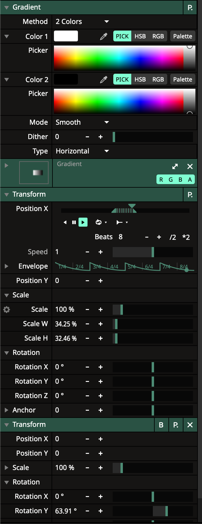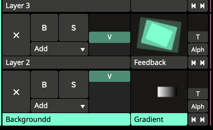 That's quite easy to achieve. I would start with a gradiant on layer 1. Then a transform afterwards put the parameters a bit like the picture I included but of course you can play around with this. ... And next, for a longer trail I would add a feedback source on layer 2 and play around with that one for the trail... You can also play around with the blend modes of layer 2. If you have this, then of course, you can always add some extra effects like a glow or may be a extra transform to rotate over the Y axis to get a bit more depth and of course mirroring will work very well. good luck. I hope this helps you out, and you'll make something nice. Don't be afraid to post your results. ;)