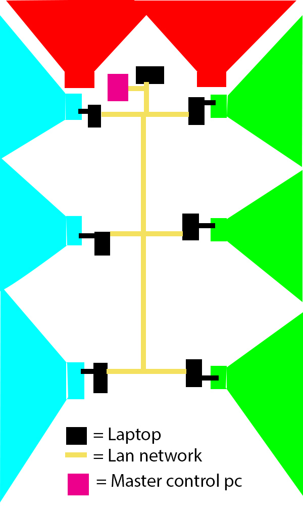 All laptops are connected to a lan network, and controlled via MIDI.