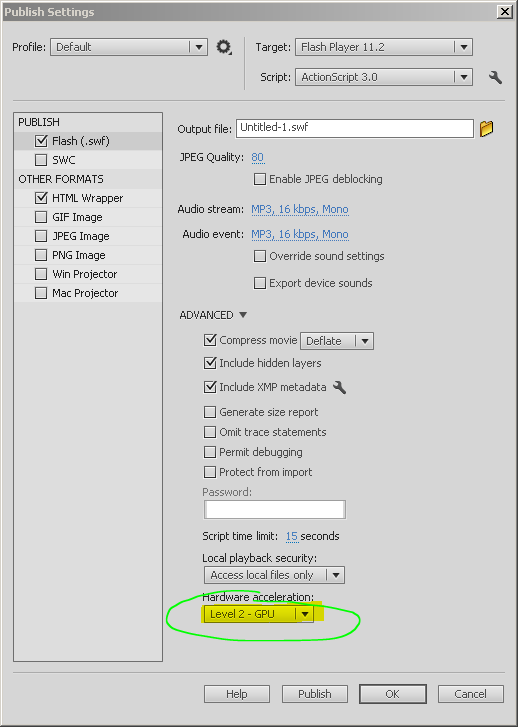 Flash has the option to publish in different hardware acceleration modes as seen below.