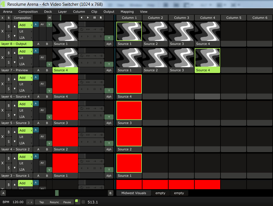I try to find a solution for the preview / program production process experienced in the tv broadcasting sector. We have installed a led wall for a live talk show where the resolume media server provides live links on the led wall. Columns in Arena 7 of one, two, three, four or five sdi inputs (each at a respective layer) are fed by the media server to the led wall.