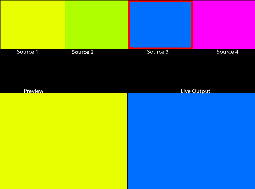 On the preview monitor you'll see each of your feeds on the top and your output on the bottom. You can select which feed you would like to send to the live output by clicking on a clip in Layer 1. When one of these clips is clicked, IR OSCA sends an OSC command to adjust the X position of the red outline.