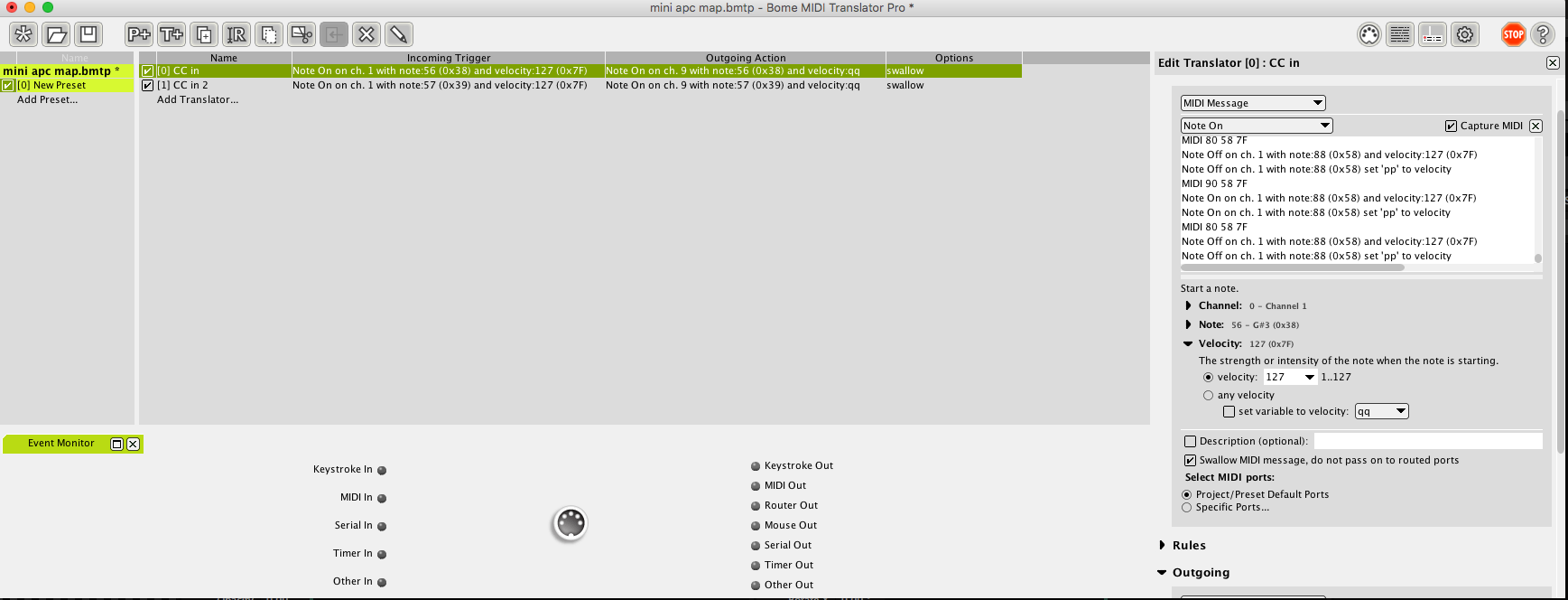 I tried re-routing 2 notes/buttons on the Mini APC in Bome so that they would be translated to MIDI channel 9. I'm not sure if I have done it right though because resolume isn't responding to any inputs from the translated buttons.