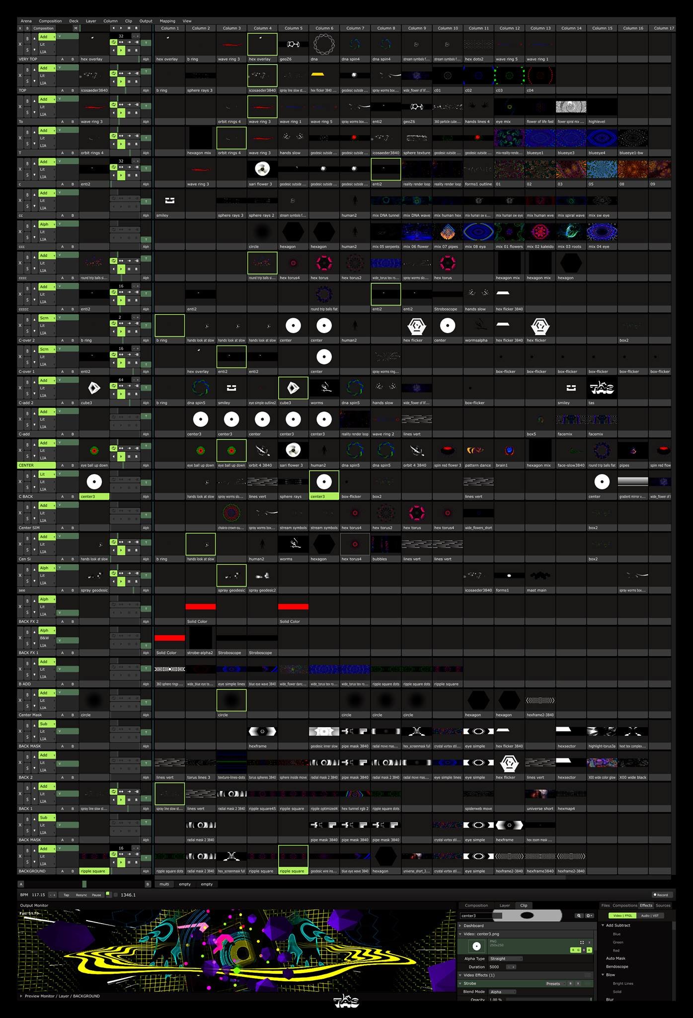 Another layer may just have different type of strobe fx , piano mapped to a midi controller so they can be 'shot' into the comp live..
