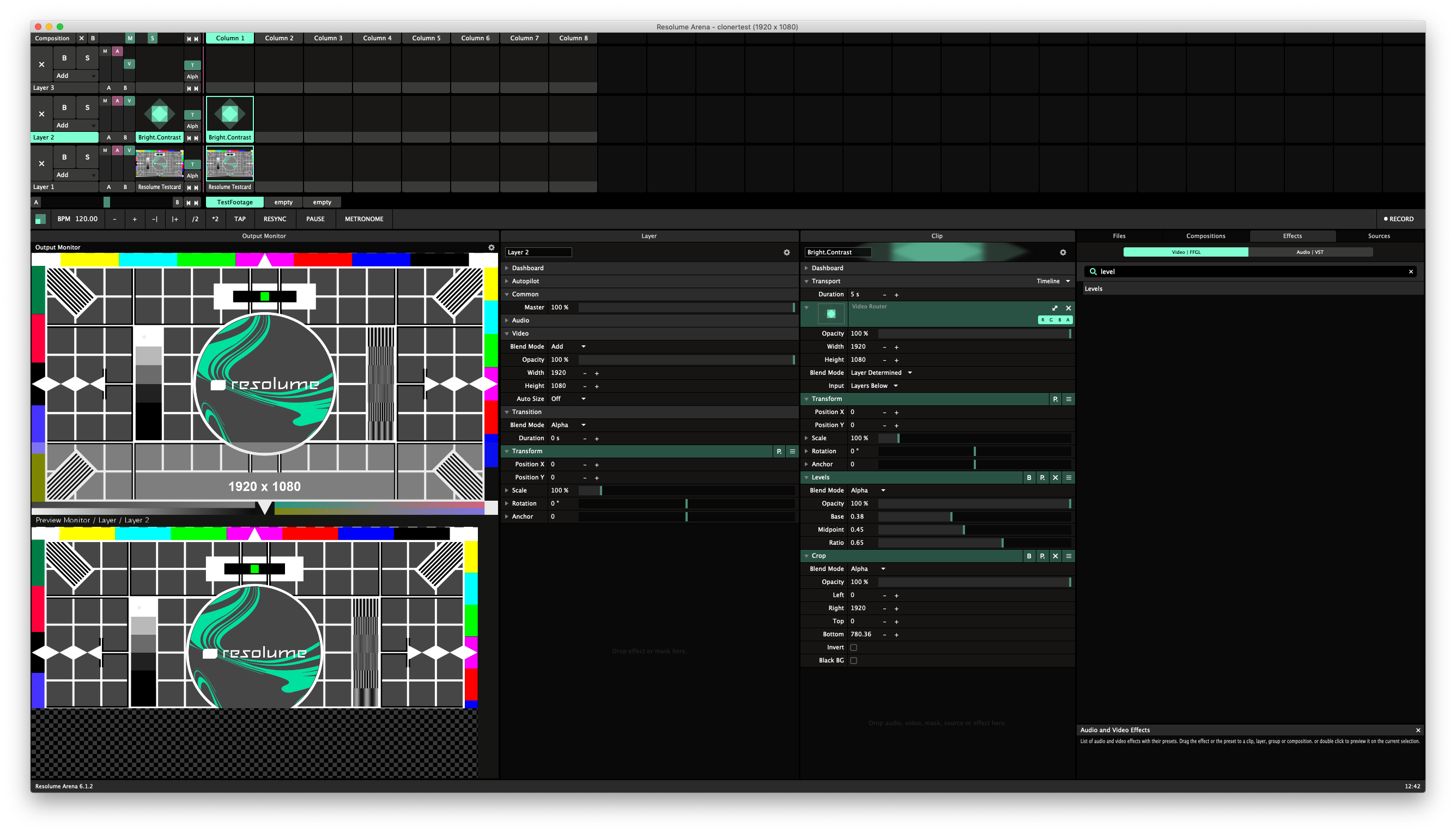 A Kings-Way would be to put a SINGLE »Levels«-Plugin with ONE single adjustment to the Composition and do the Calibration just for one time for all playing stuff at once (and NOT for every clip in additional layers).