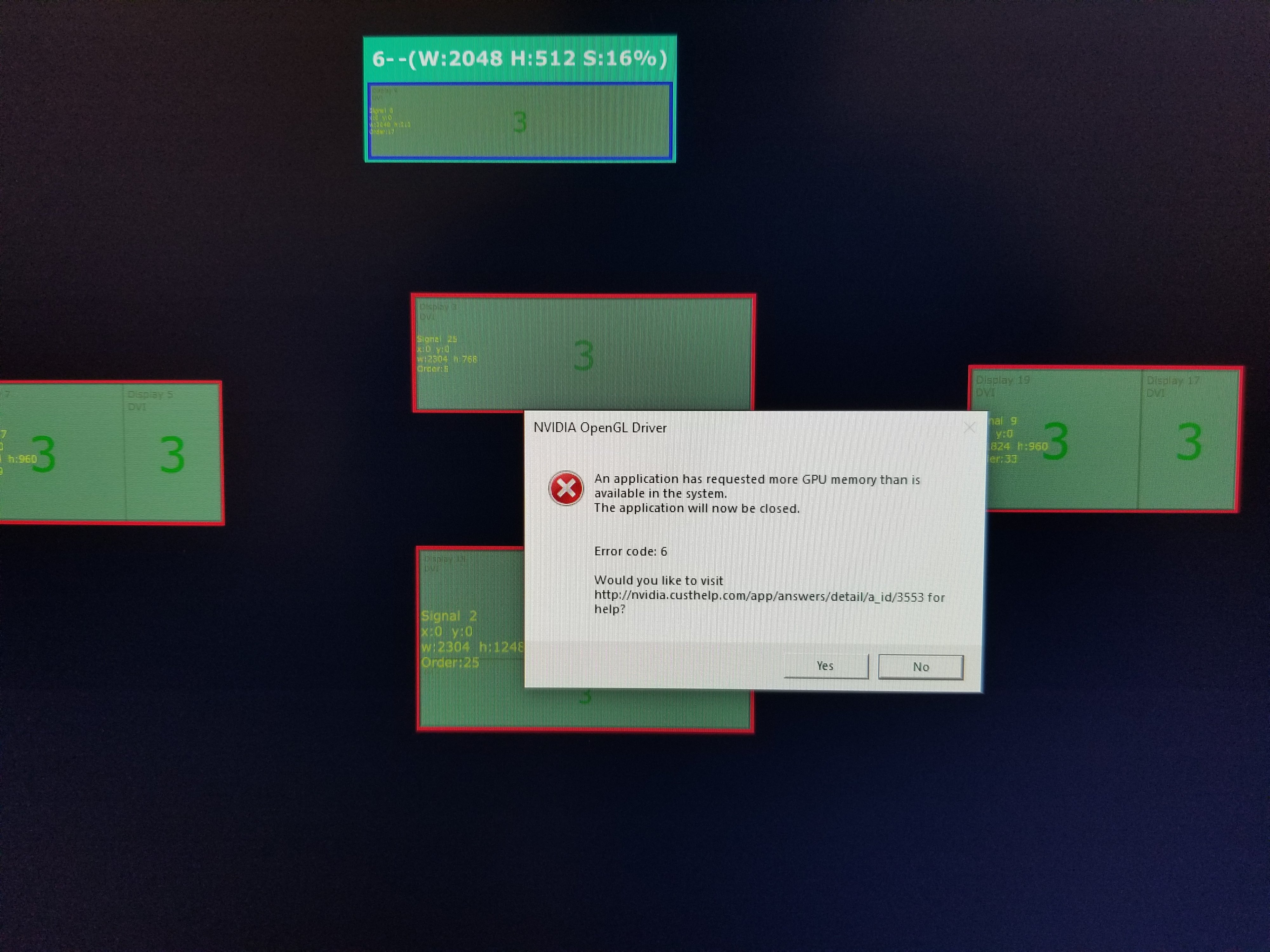 I have contacted Nvidia and they said to update windows fully, any drivers, and the bios. We are planning to do this to fix the Nvidia GPU error *hopefully*, but I'm still not sure how or why the mapping on just 1 output is changing, seemingly from Resolume advanced output. The rest of the outputs and content are fine. Just this 1 section jumps down.. sometimes its 2 or 3 pixels, sometimes is more like 50-100 pixels. Not sure if the GFX out of memory has anything to do with this or its a completely separate issue.