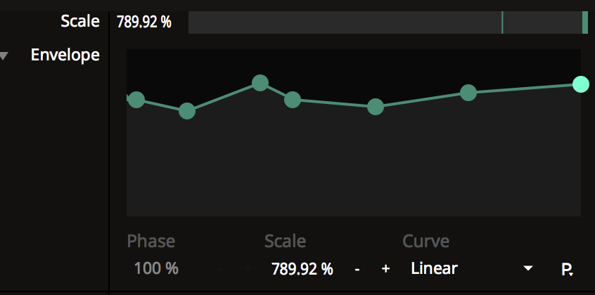 In this shot, the param slider is at 50%, the small dot in the envelope is at 50% horizontal, the envelope says it needs to be at 90% vertical. This vertical position is your output value for the parameter.