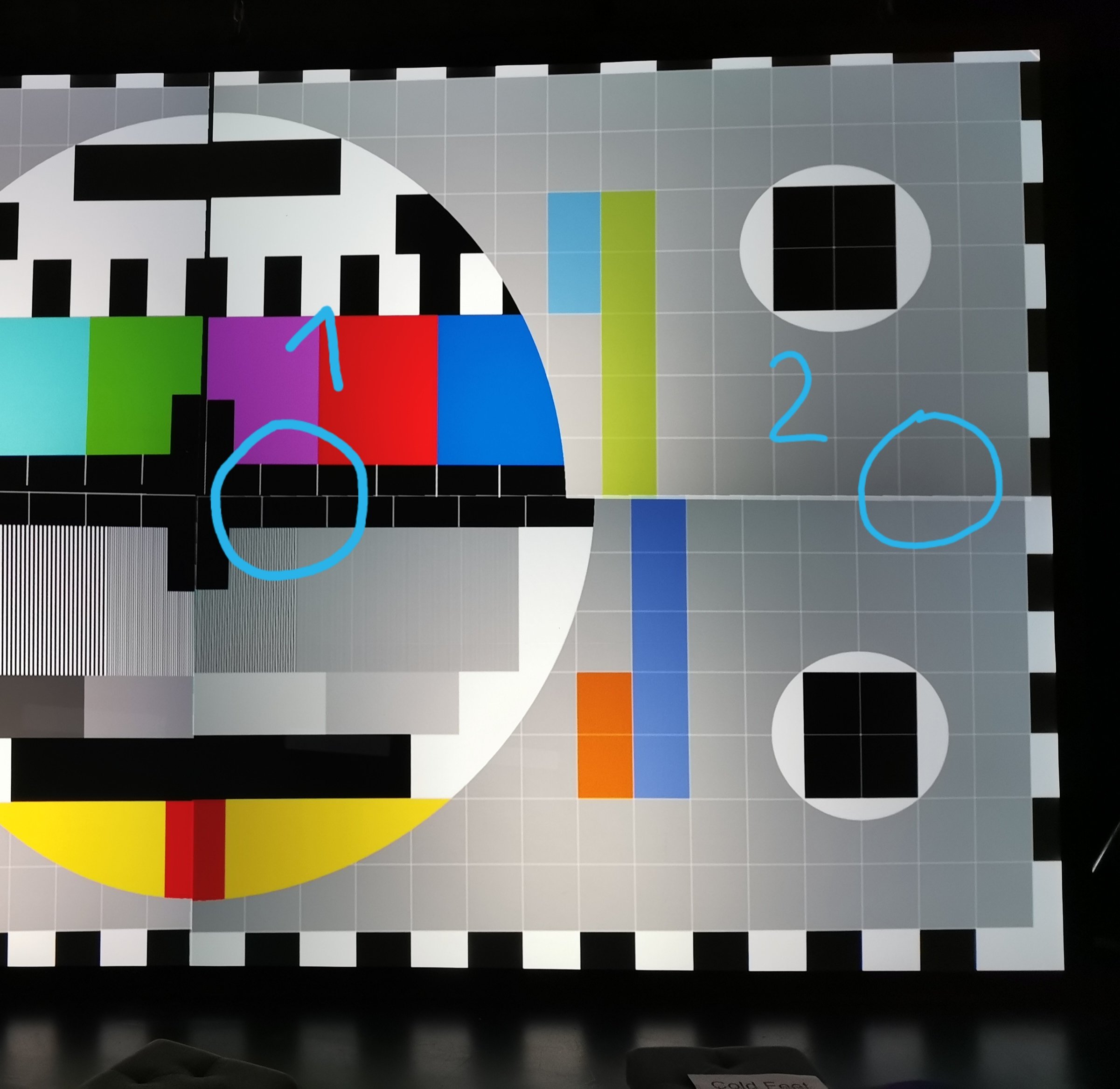 As you can see in circle 1,the upper squares are smaller than the lower ones, and in circle 2 to the right it's the other way round. So if I fix it on the right, it will be wrong on the left and vice versa. How can I fix it, does it have to do with the physical position of the beamer?