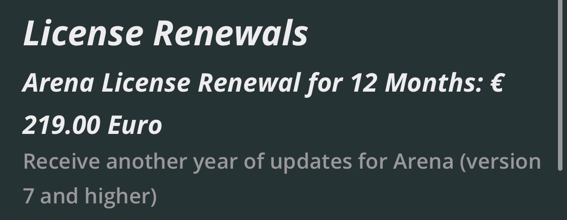 Make an offer take em off my hands cheap cheap for the first to have the payment sent. PayPal for payment only. Will have to ship arena 7 dongle to purchaser from central USA. Plan accordingly and make offer worth going outside to ship the dongle. I do not believe the arena 6 license can be separated. So all or none on the arena 6 license for 3 computers+1. Attached screenshots just show my current costs to upgrade 6 to 7 for 3 computers and the renewal of 12 month updates of 7 on dongle. Best wishes to the next user/users.