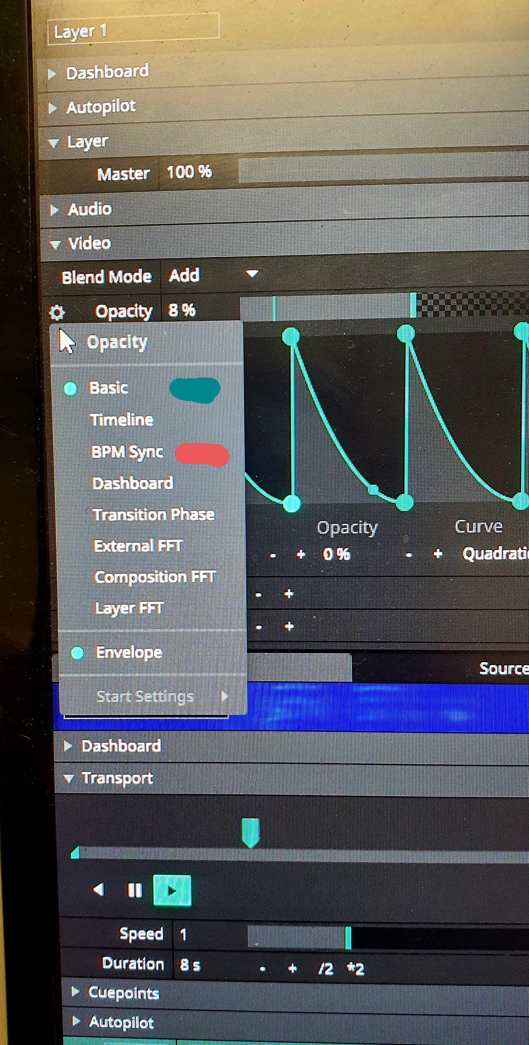 I want to be able to BPM sync the opacity so it bounces to the beat, but then I want to hit a button to regain manual control of the layers opacity