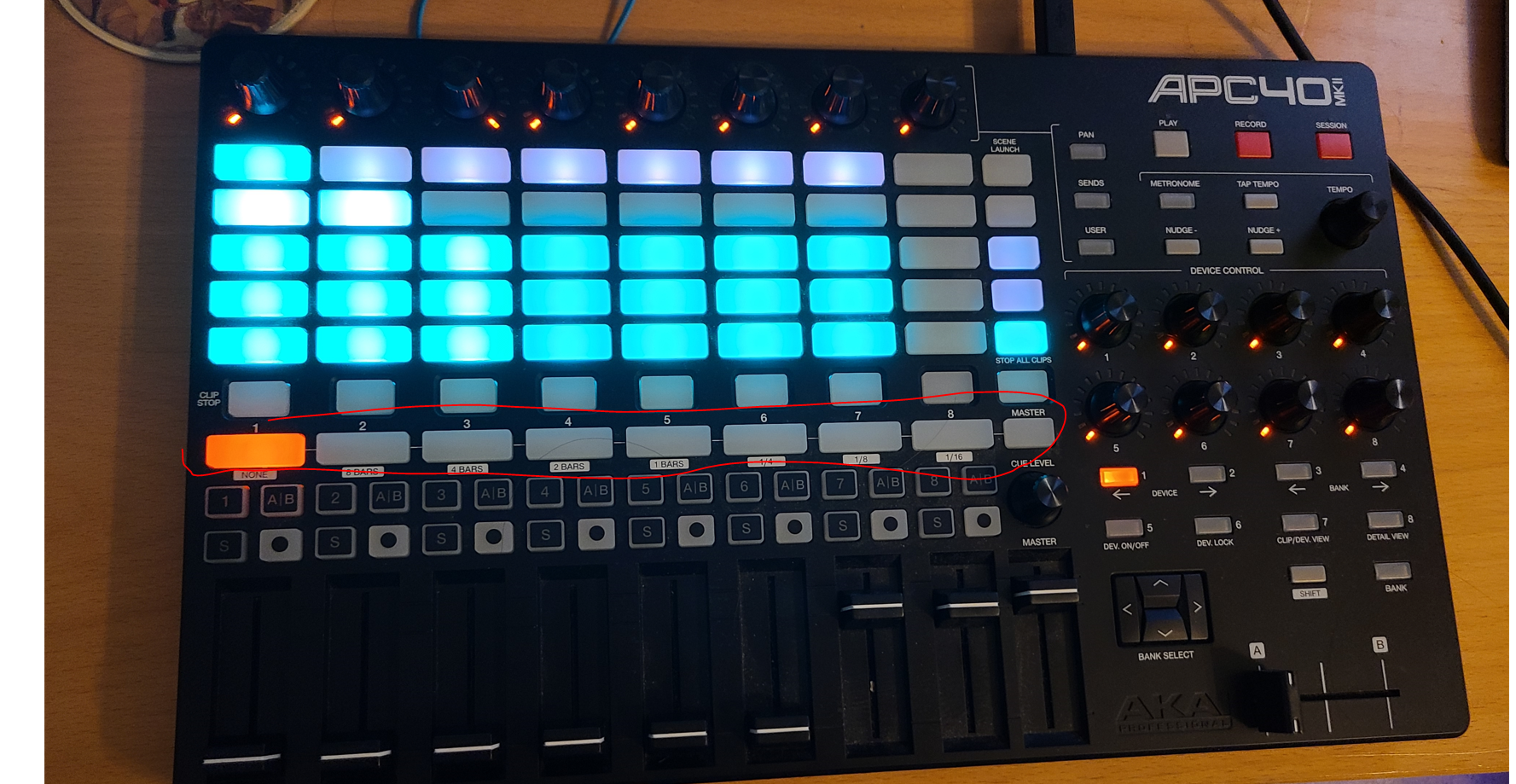 I am using an APC40 MKII. I had set a MIDI map earlier this week, that used 1/A#3 through 1/C#4 (attached is a picture of the buttons I am referring to) to change through decks. But now, those buttons instead change my device's MIDI channel and it has completely messed up my MIDI knob layout. THIS ISSUE HAPPENED AS I WAS PERFORMING ON THE DEVICE, AND WILL NOT CHANGE BACK.