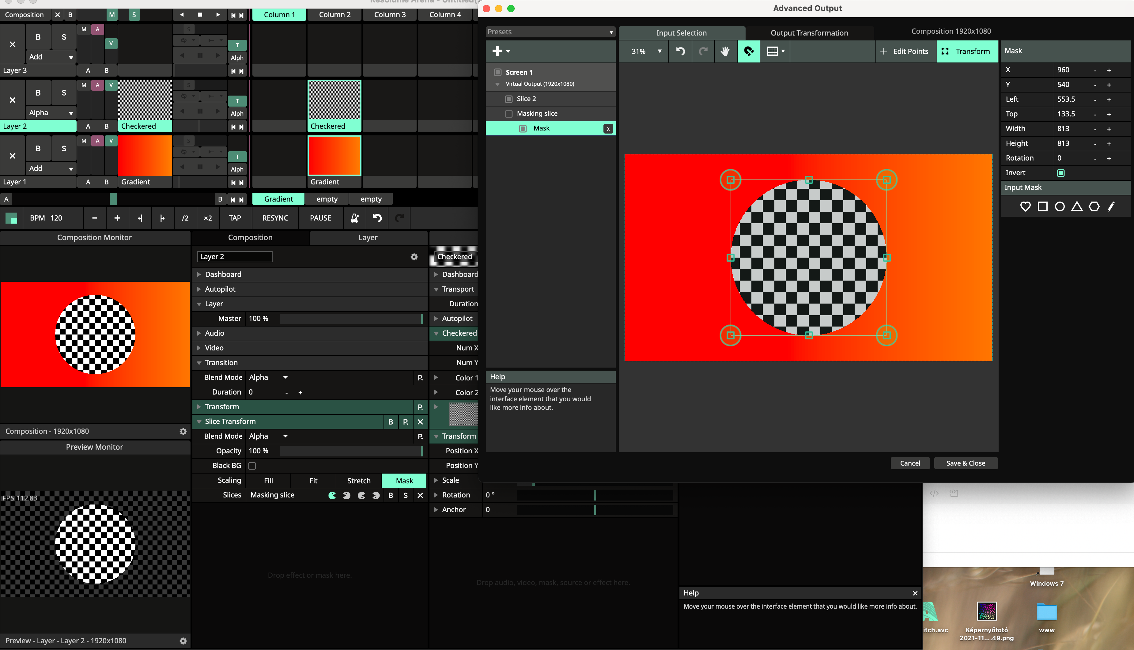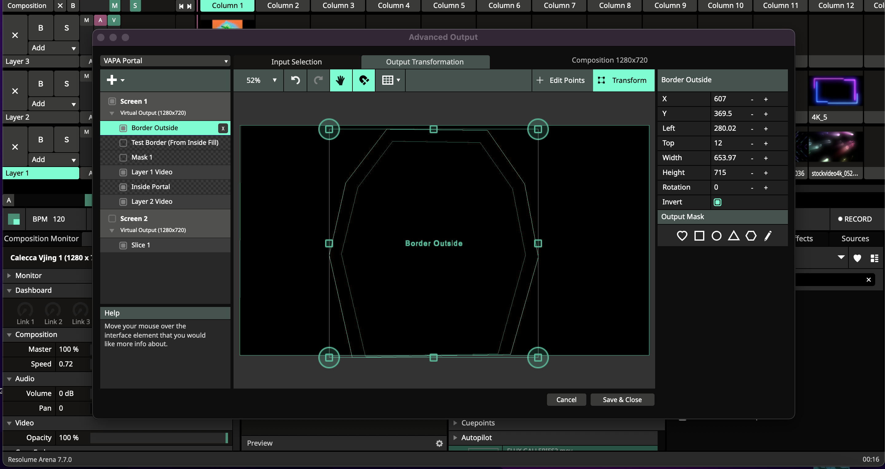 I've been creating different sizes and types of output masks with screen 1 being the smaller mask and linking itself to Layer 1 while screen 2 is masked to the edge of the border around the octagon and is linked to Layer 2. I just can't seem to find a layer/mask order that allows you to see each video distinctly separate from one another. Do I need to adjust Input Masks? What simple thing am I doing wrong here?