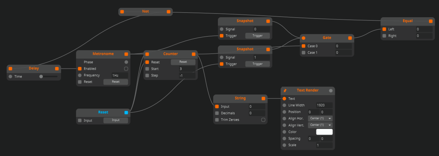 The Equal & Not nodes stop the metronome when the counter reaches 0. The "Reset" Trigger (blue) resets the counter and also updates the display. But it also restarts the metronome, which is not intended. So how can I make the counter reset and update the number shown, but without restarting the metronome?