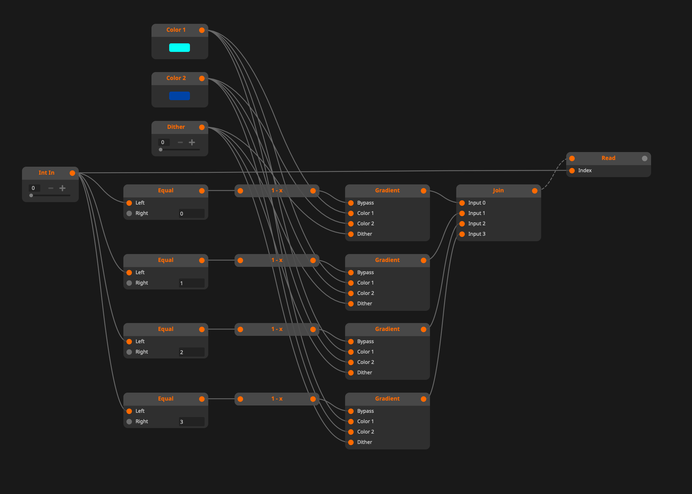 As you can see from the screenshot, I'm am currently using a workaround, using Choice In and Switch (not shown) to choose between 4 Gradient node variants, which may incur a performance hit (haven't tested to compare).