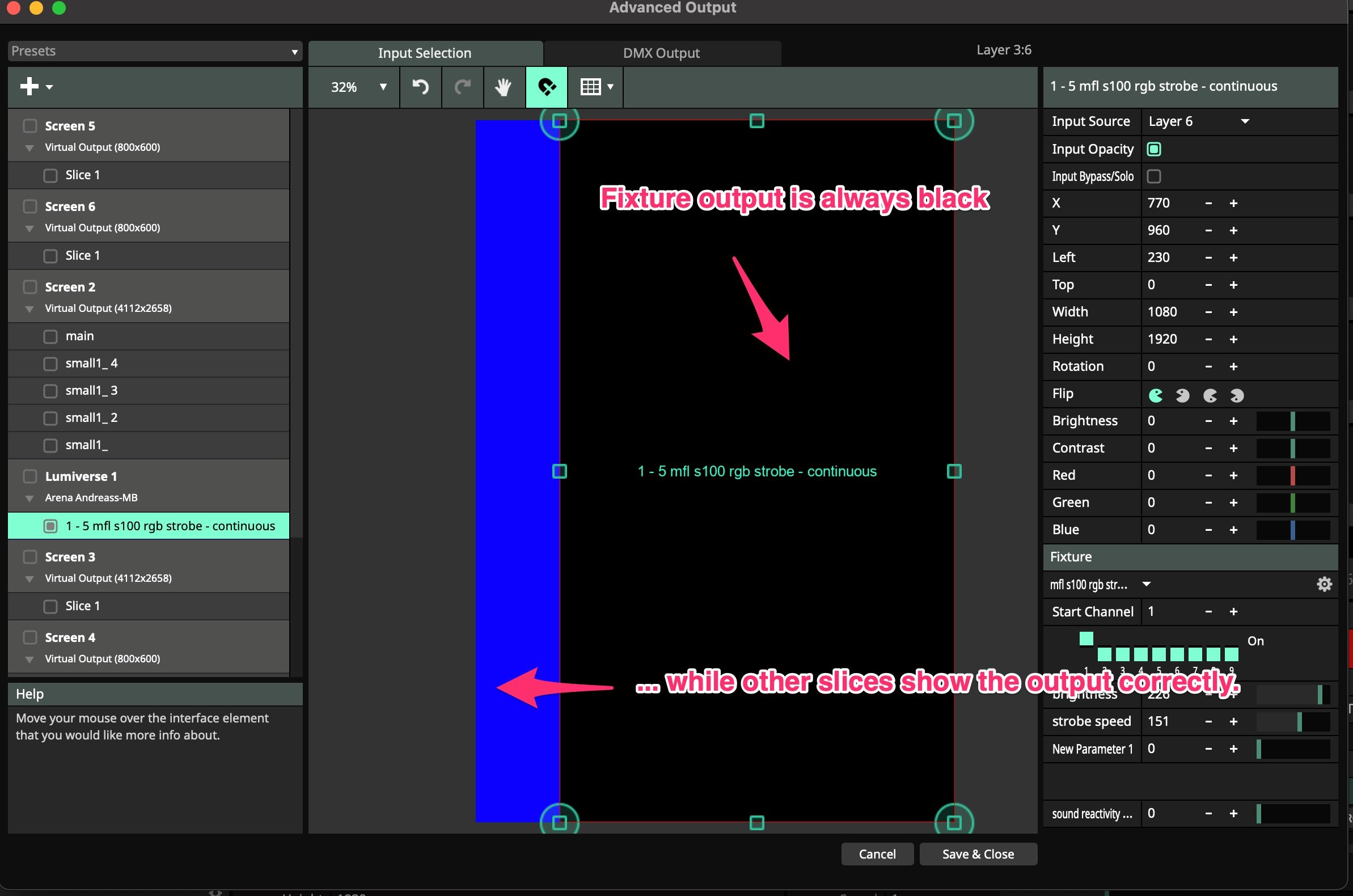I'm pretty new to sending DMX signals to lights, so this might be a really basic question. Setting up DMX lights is hard enough, but I can't even get the fixture to show anything in the output. I've selected the 'input source' (both specific layers and the whole composition), but the output is still black. The "Dummy Fixture" and all regular 'screen slices' shows the output just fine with the same settings.