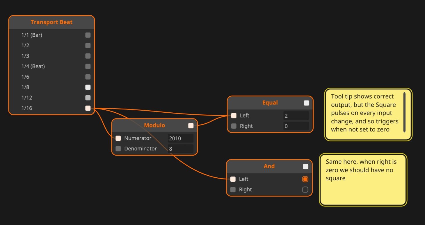 "value": "Tool tip shows correct output, but the Square pulses on every input change, and so triggers when not set to zero\n"