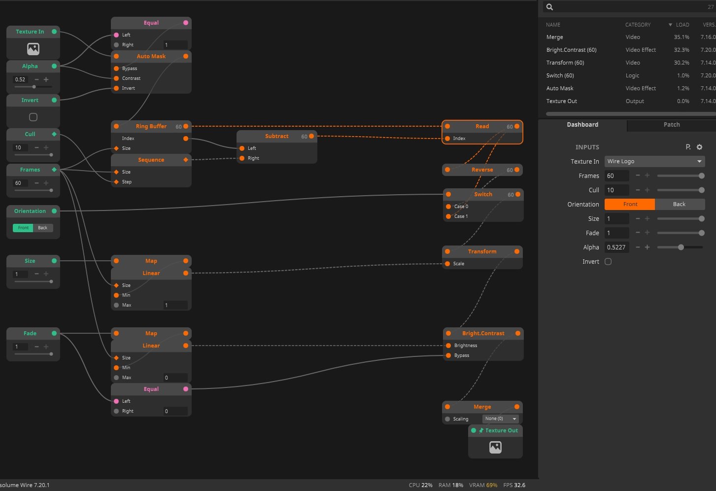 In the patch below the Ringbuffer outputs 60 instances(frames) with the step of 10 from the Sequence the Read-node only selects the first 6 indexes in range of the Ringbuffer (0-10-20>60). Resulting in only 6 frames renderd but 60 instances active. It would be nice to reduce the instance number to 6