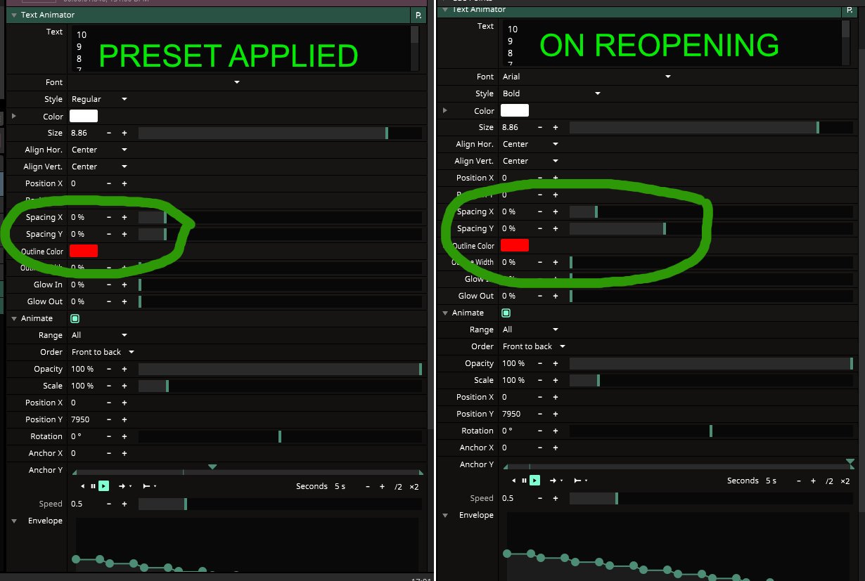 The bug I originally posted here is related to Spacing Y in Text Animator. You can see below that something very strange is going on. While both of them display 0%, the buggy one's slide is not on the 0% position.