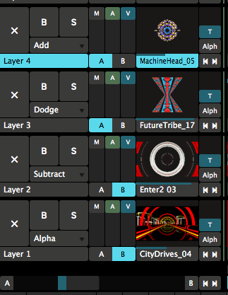 Resolume 会把指定了的图层先合成。当交叉推杆推到最左,它只会显示A讯号汇流路径内的图层。当交叉推杆推到最右,它就会显示B讯号汇流路径内的图层。当大概在中间时,两个讯号汇流路径内的图层就会混合在一起。