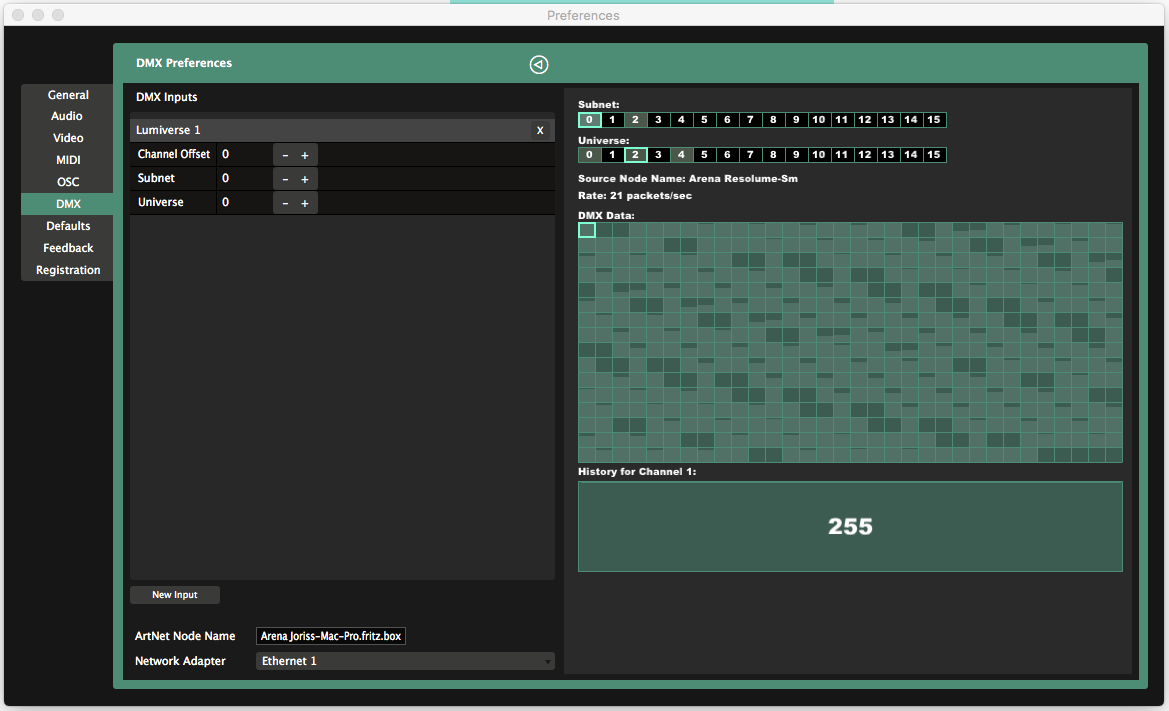 主要的分别是你使用的是Art-Net而不是MIDI,所以首先你需要让Resolume知道你在发送Art-Net. 做法是需透过偏好设定中的DMX栏列。